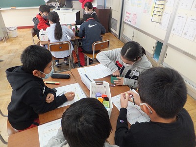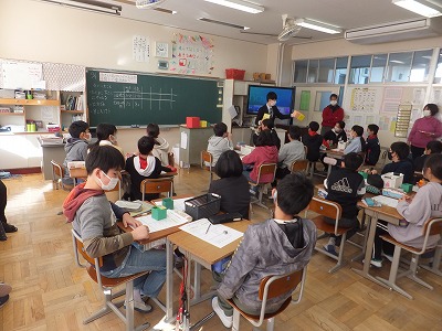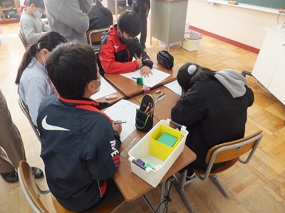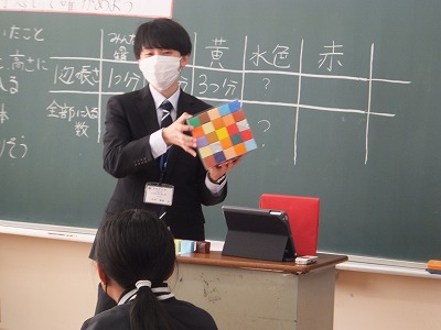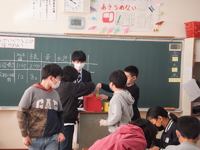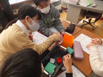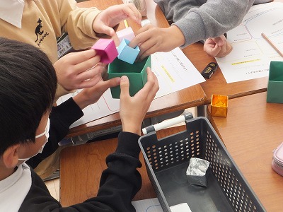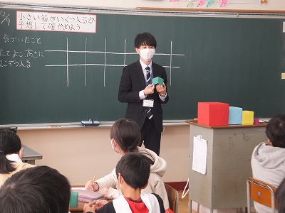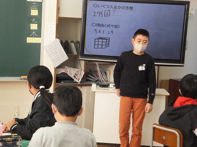 では、この赤い箱にはなんこはいるでしょうか?みんなが昨日作った箱を一人1個ずつ入れてみて。
