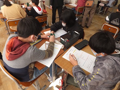 緑の箱に、昨日折った箱は何個入るでしょうか?予想してみよう。