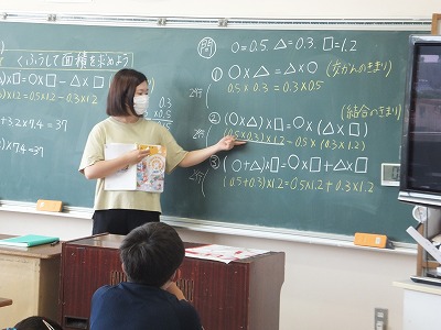 結合のきまり、分配のきまり、交換のきまりを使って、面積を求める問題を解きました。