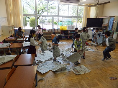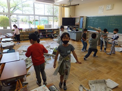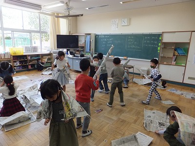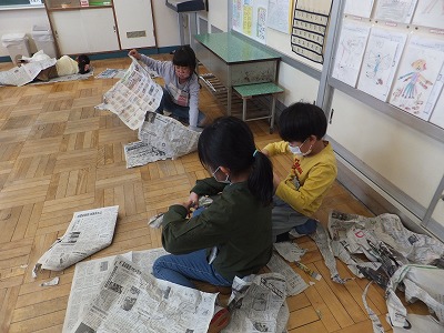 図工の時間に、新聞紙を使って造形遊びをしました。