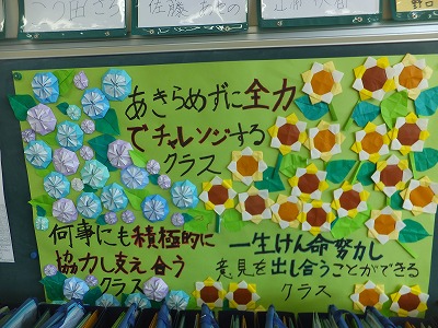 5-2の学級目標です。折り紙を使って、とてもいい感じにできています。「あきらめずに全力でチャレンジするクラス」のなるといいですね。