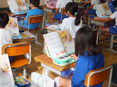 鍵盤のハーモニカの指の練習をしながら、音階のテストもしています。