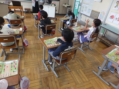 算数の時間は、同じものが何個あるかとか、どんな形が何個あるかなど、仲間分けや数の数え方の練習をしました。