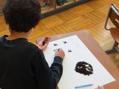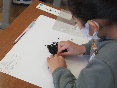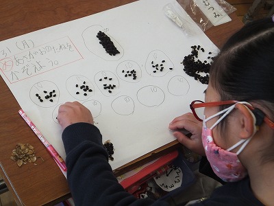 今年育てた朝顔の種をとっておきました。たくさんある種をどのように数えればよいか学習しました。