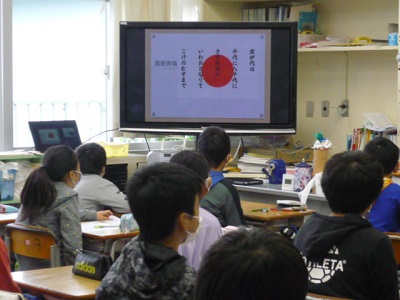 国歌斉唱は、画面を見て歌っています。
