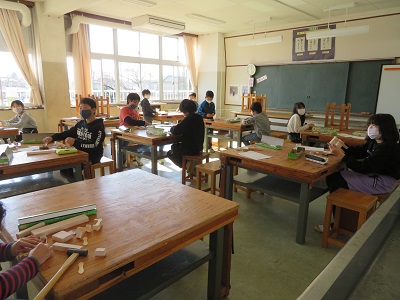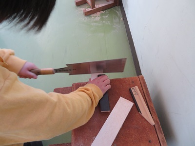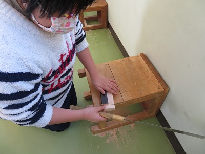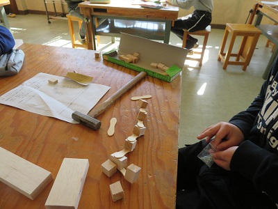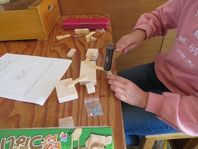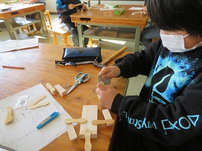 4年生が図工の時間にのこぎりと金槌を使い、工作をしました。