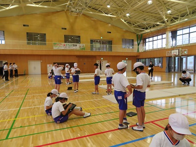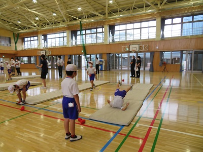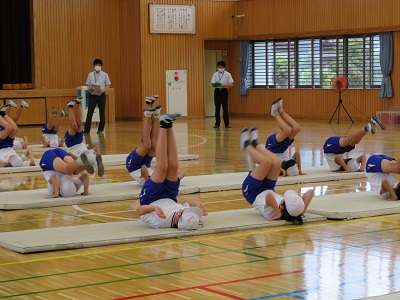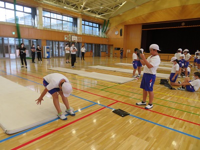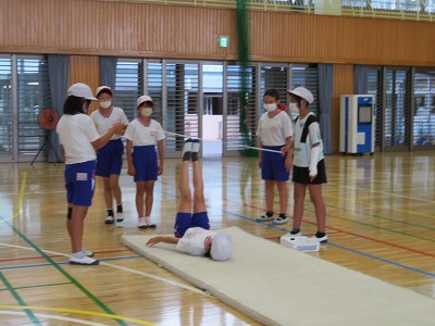 5年生は、体育のマット運動の研究授業です。