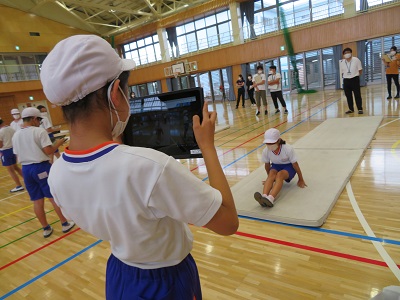 タブレットを活用し、伸膝後転のポイントを確認しました。(ICTの活用)