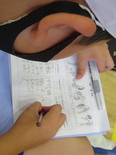 自分の伸膝後転を友達に撮影してもらい、上手に出来るようになるポイントを友達と話し合いました。