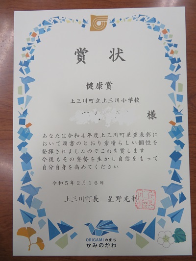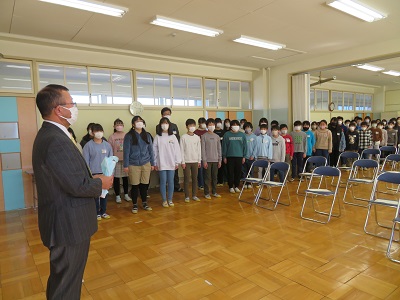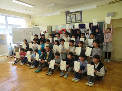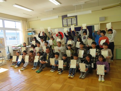 町長さん自ら学校にお越しになり、6年生の児童一人一人に賞状を渡してくれます。