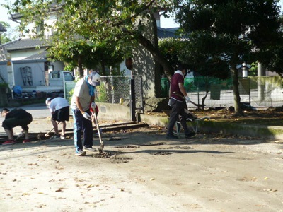 側溝にたまった土を保護者駐車場の凸凹に埋めています。
