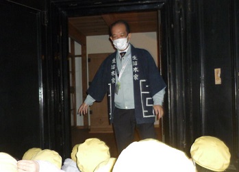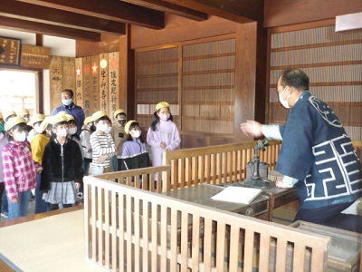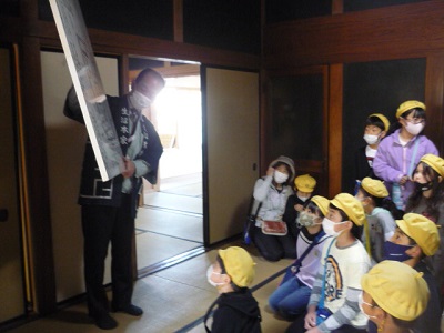この日の午前中に、3年生が生沼邸を見学しました。建物の説明は、町生涯学習課の方にしていただきました。生沼邸の脇にある十字路は、石橋に繋がる道と結城に繋がる道で、たくさんの人が行き交った場所だそうです。中に入ると、時代劇の世界そのままの商家の造りが見学できました。生涯学習課の方も、生沼家の半天を着て説明してくださいました。靴を脱いで、部屋の中も説明していただきました。大きな扉の蔵が、一番奥にありました。時計台のある公園脇に、生沼邸があります。中には入れませんが、近くに行かれた時は、建物の様子を見てください。