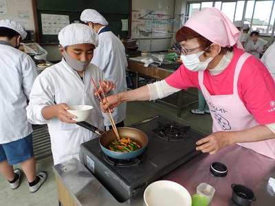 昨日お知らせした6年生の調理実習では、食生活改善推進員さんが調理のサポートをしてくれたり栄養に関するお話をしてくれたりしました。