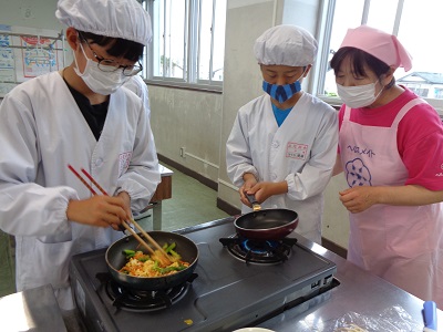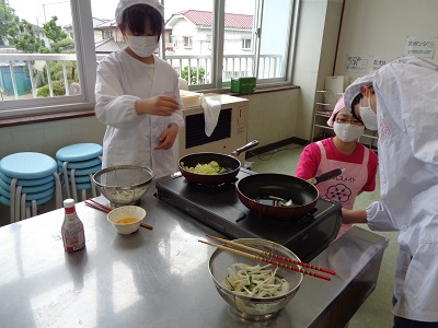 調理実習の感染対策として、クラスを半分に分けて少人数で調理を行いました。