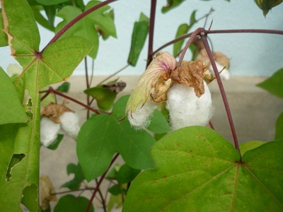 真っ白な綿(わた)を出しました。これから、どんな色の綿が顔を出すのでしょう。楽しみですね!