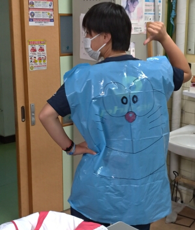 男子は、青いビニール袋にドラえもんを、女子は、黄色のビニール袋にドラミちゃんを描きます。