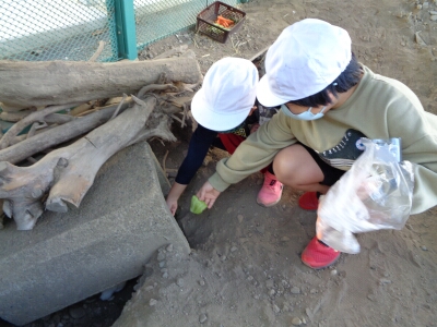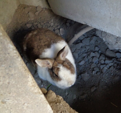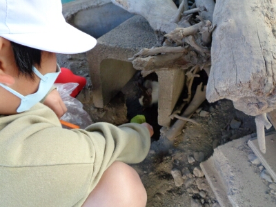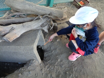 タイミングが合うと、ウサギが穴から出てきて、餌を食べさせることができます。子供たちは、当番が回ってくると、楽しそうに飼育委員会の手伝いをしています。