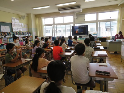 全校集会ができないので、今回も放送室からZOOM朝会を行いました。