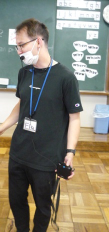 ハンズフリーマイクで英語の指示をします。