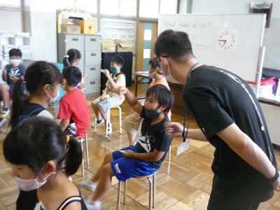 答えは、桃太郎です。What time is it?を言う人がこのマークを付け、時間のカードを持って待っています。