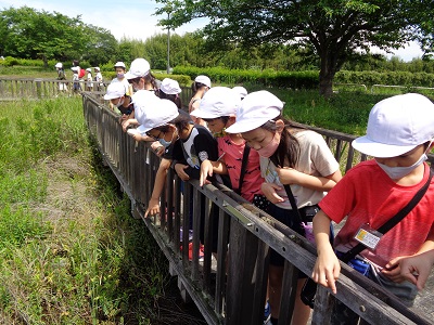 蓼沼親水公園では、水辺に生える植物を見たり、鯉を見たりしました。
