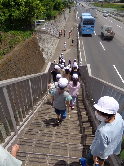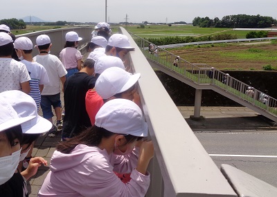 最後に、明治南小学校の南にある歩道橋に上り、土地の高低差や土地利用の様子を確認しました。