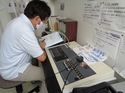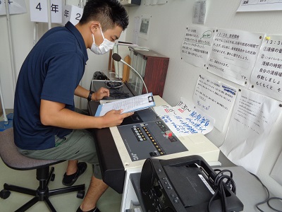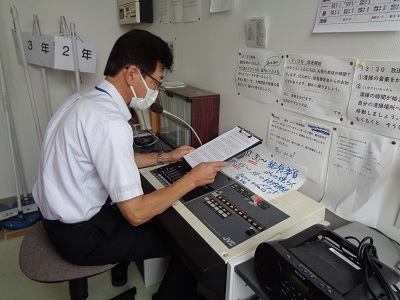 教頭先生から、「竜巻が近づいてきました。先生の指示に従って避難してください。」と放送がありました。