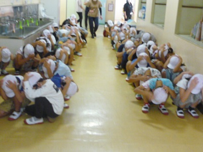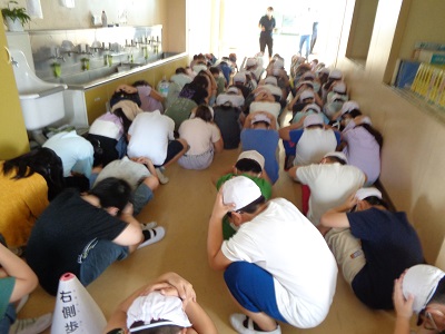 先生の指示に従って、ガラス窓から離れた安全な場所に避難しました。