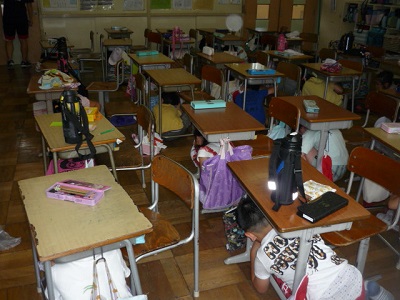 合い言葉の放送があり、違う階の児童も静かに隠れます。