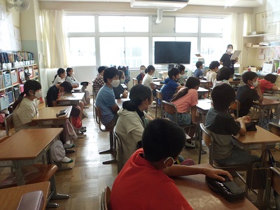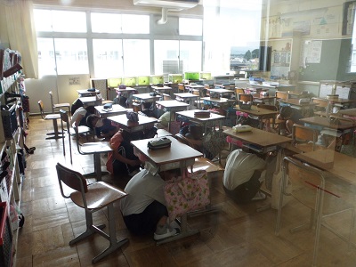 周りの安全を確認できたことを校内放送で知らせ、机の下に避難するのが終わりになりました。最後に、校長先生の話を聞いたり、担任と振り返りをしたりしました。