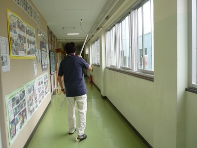 次に、1階廊下に不審者がいるという設定で避難の仕方を練習しました。