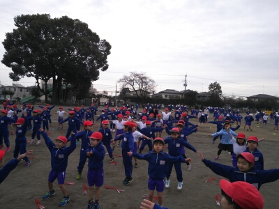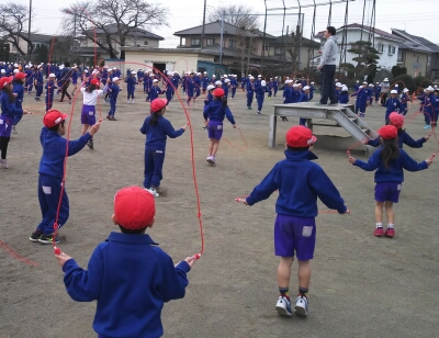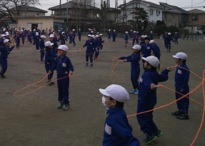 体力作りで、全校生で短縄跳びを行いました。