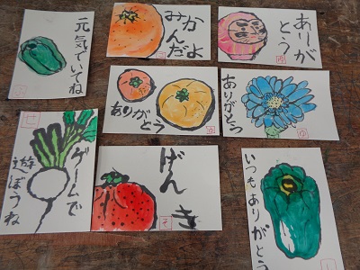 絵を描き終えると、絵手紙を渡したい人を思い浮かべて、一言を書きました。