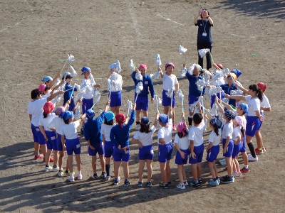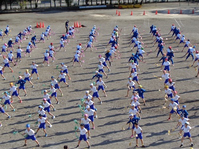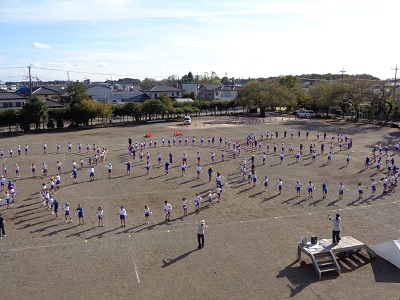 体育館で踊っていたときよりも動きが大きくなり、上から見ていても列や円に綺麗に並んで踊ることができています。