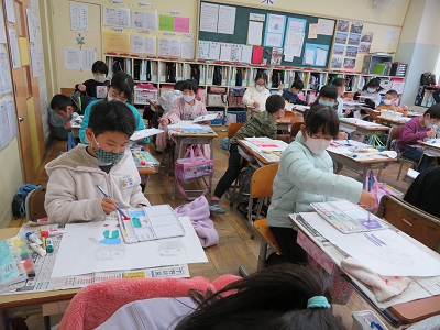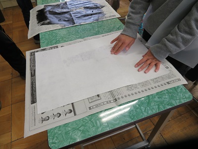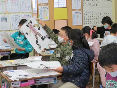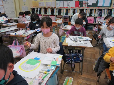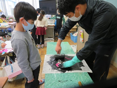 3年生は、ボタンや毛糸などの身近な素材を使い、紙版画で人を刷りました。