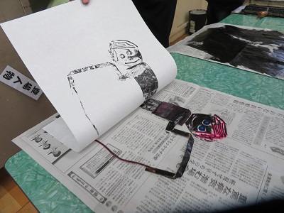 ローラーで黒いインクを付け、印刷します。