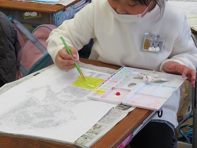 乾いたら、周りに絵を描いたり、裏から色を塗ったりします。