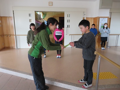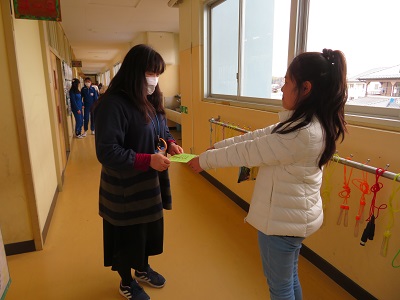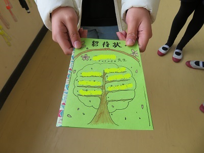 なかよし班で1年間お世話になった先生に、一言添えて手渡しました。
