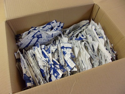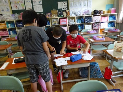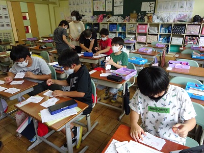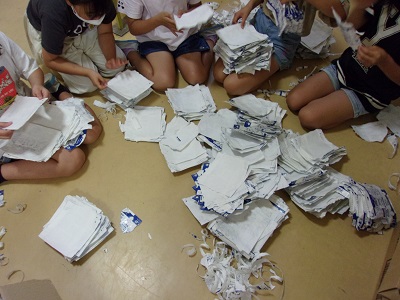 牛乳パック回収の条件に合うように、点検をしたり、やり直しをしたりして、毎日当番が頑張っています。