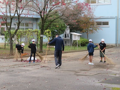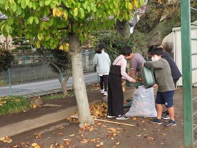 5年生で朝の時間に落ち葉掃きを実施しました。