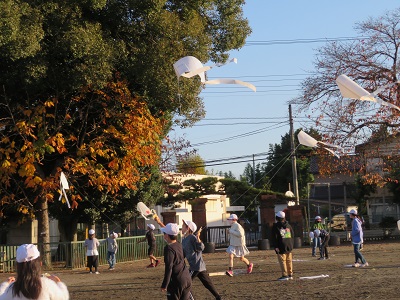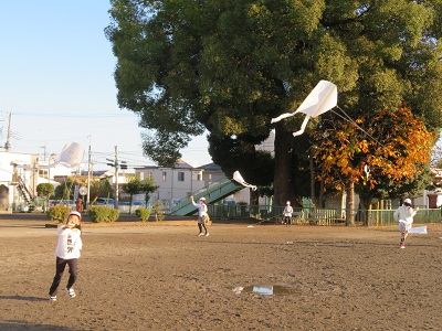 最近見かけなくなった光景ですが、この日は、校庭にたくさんの凧が揚がりました。