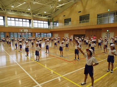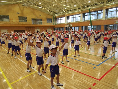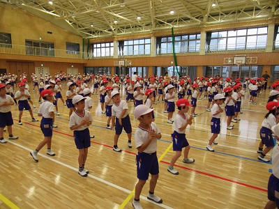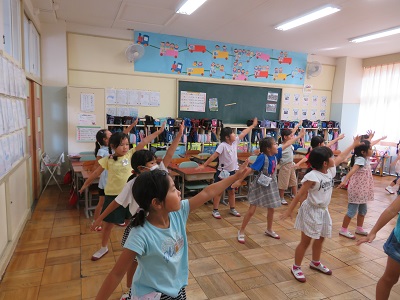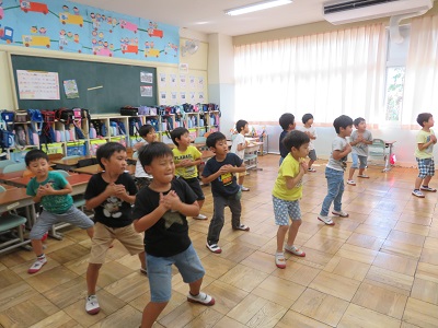 1、2年生は、くれよんしんちゃんの映画の主題歌、ももクロの「笑一笑(シャオ イー シャオ)の曲に合わせてダンスを踊ります。