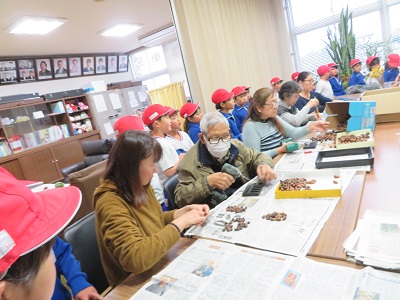 商工会女性部の方が、自分たちで拾った銀杏の実に絵を描いてストラップにしたものを、新入生にプレゼントしてほしいと依頼にいらっしゃいました。