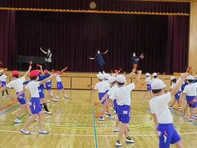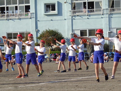 昨年度は、3、4年生に「YOSAKOI かみのかわ」を教えていただき、運動会で踊りました。鳴子も貸していただきました。