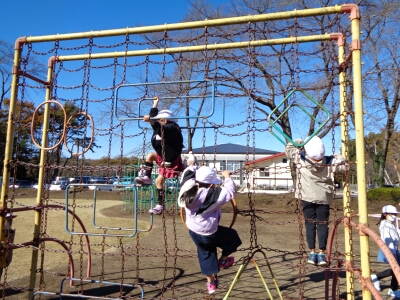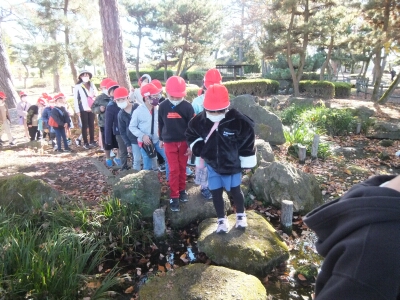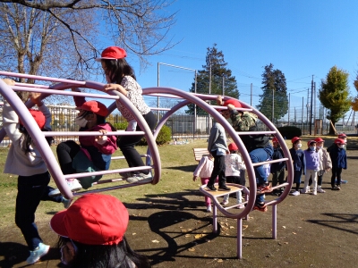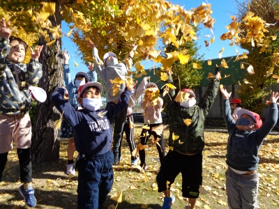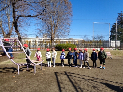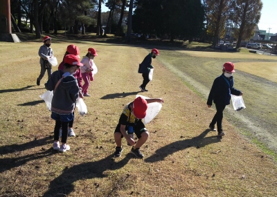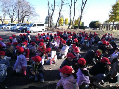 木の実拾いをするするグループと公園で遊ぶぶループに分かれて、楽しく活動してきました。拾ったどんぐりや松ぼっくりは、おもちゃ作りやリースの飾りに使う予定です。