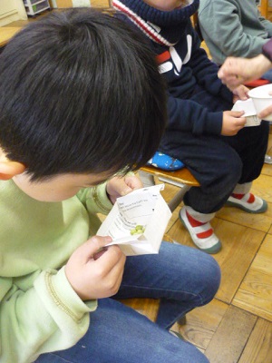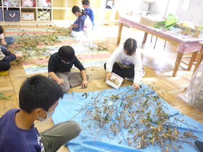 かがやき学級で育てた大豆を使って、節分に豆まきをしました。
