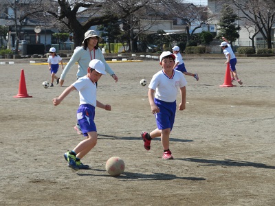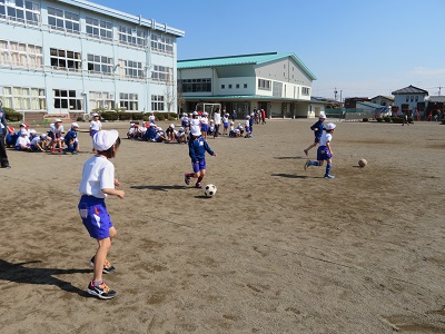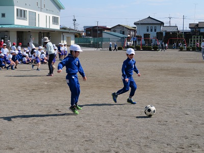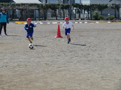 2年生が学年体育で、ボール蹴りリレーをしました。