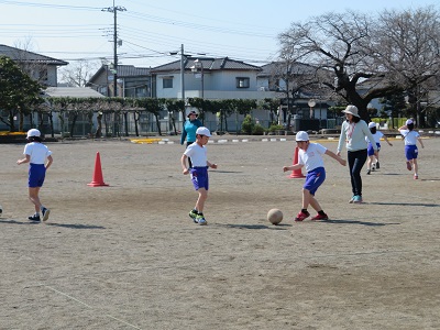 2人でボールをパスをしながら、カラーコーンを回ってくるリレーでした。