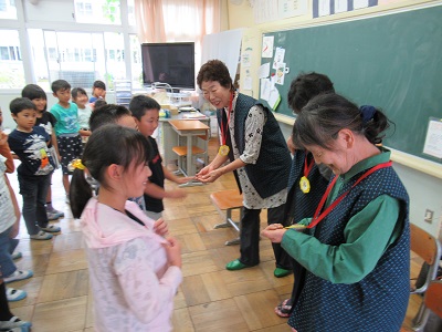 民話を聞かせていただいたお礼に、2年生からメダルのプレゼントがありました。