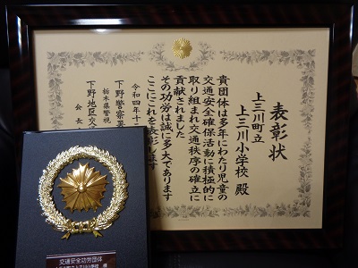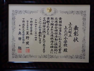 12月14日(水)に下野警察署で行われた下野地区交通安全功労者等表彰式で、上小が「交通安全功労団体」として、下野警察署長と下野地区交通安全協会長の連名表彰を受けました。